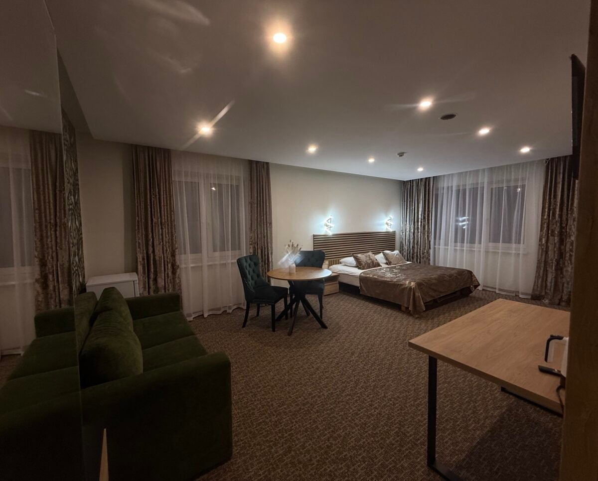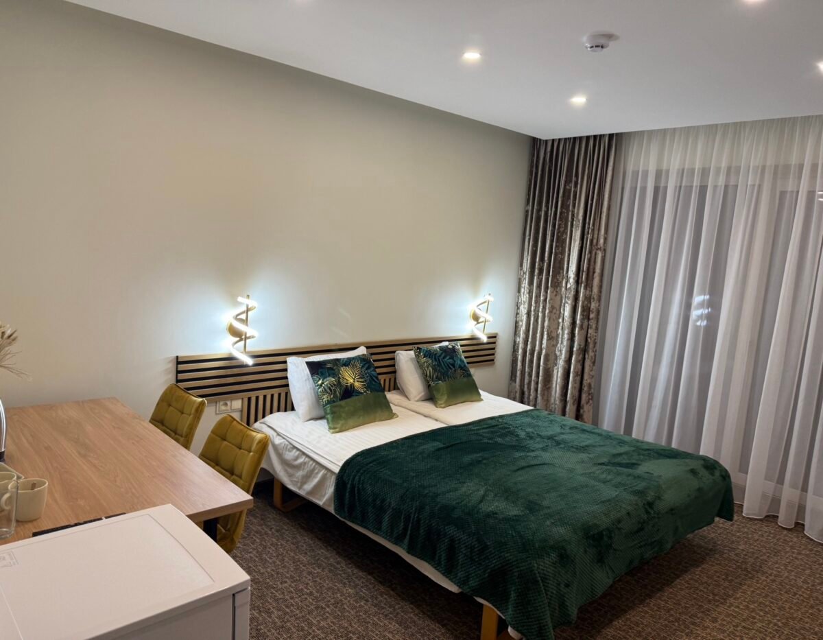 Dvivietis liukso kambarys su dušu ir tualetu. Nemokamas Wi-Fi, virduliukas, šaldytuvas, balkonas.